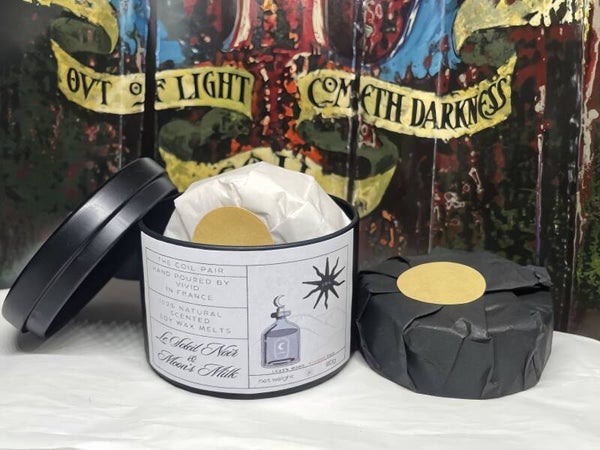 Immerse yourself in the allure of Moon's Milk and Le Soleil Noir - a tribute to Coil, where soy wax meets marvelous masculine and feminine fragrance notes, inviting you to embark on a voyage of the senses.